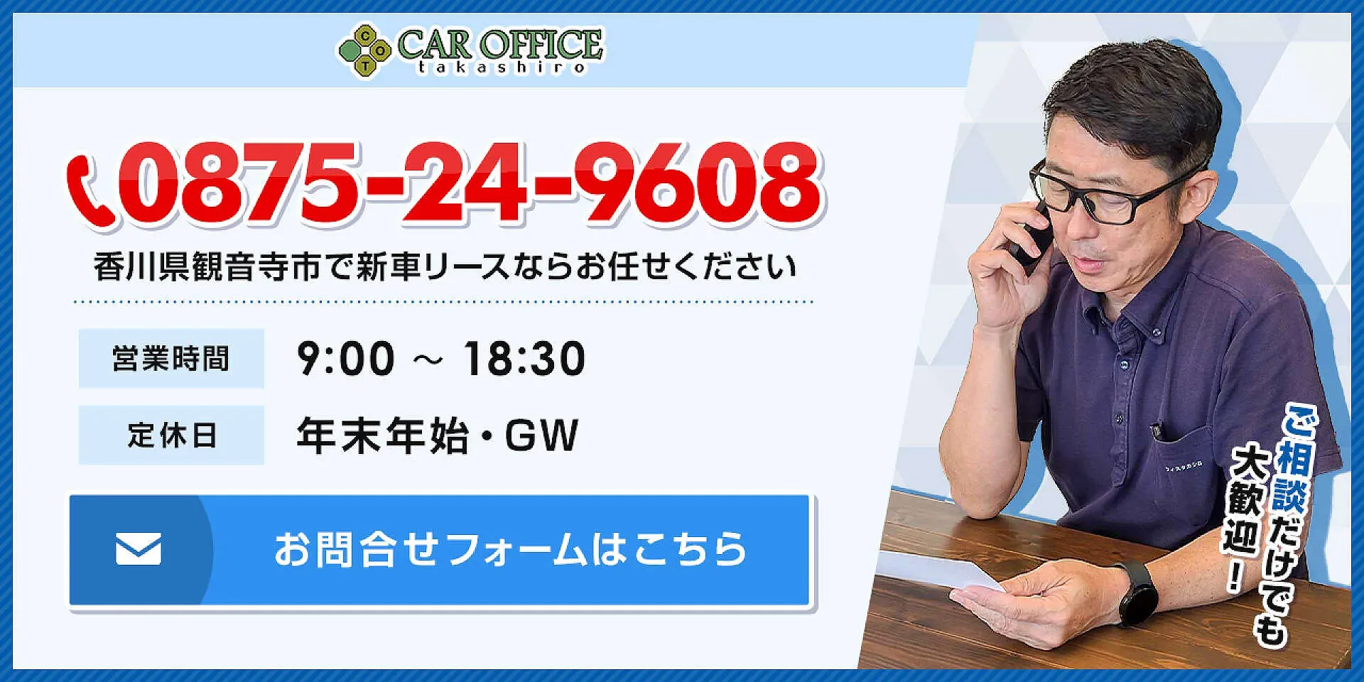 観音寺市のカーオフィスタカシロでは、軽自動車や乗用車など8台ほど代車を完備。